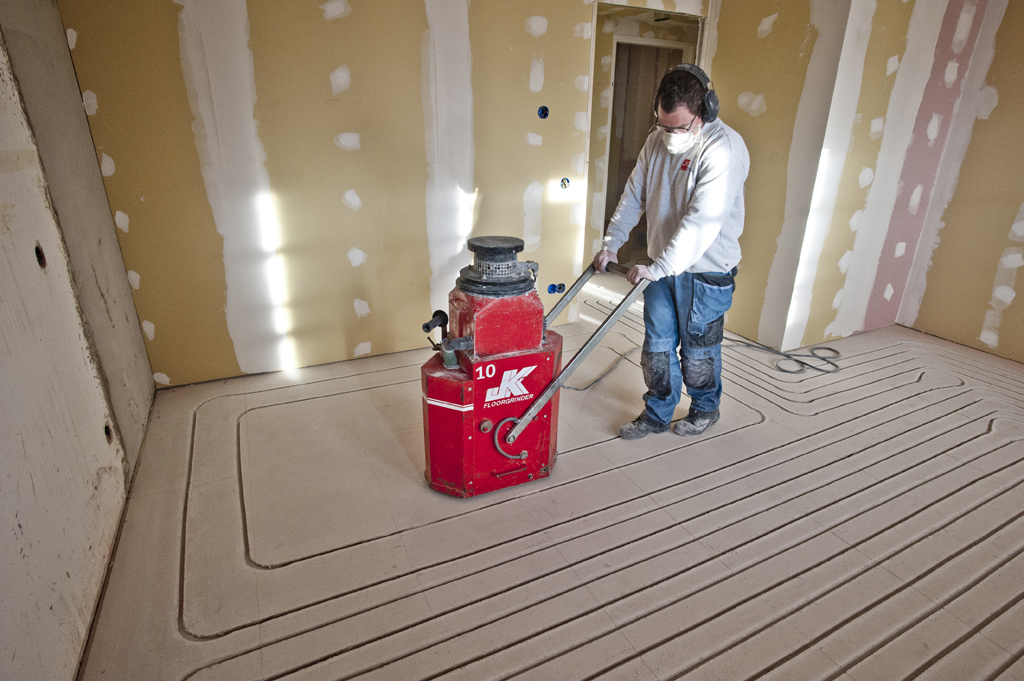 JK freesde vervolgens een strak sleuvenpatroon in deze vloer, waarna de 14 millimeter vloerverwarmingsbuizen voor de vloerverwarming in deze sleuven werden gemonteerd.